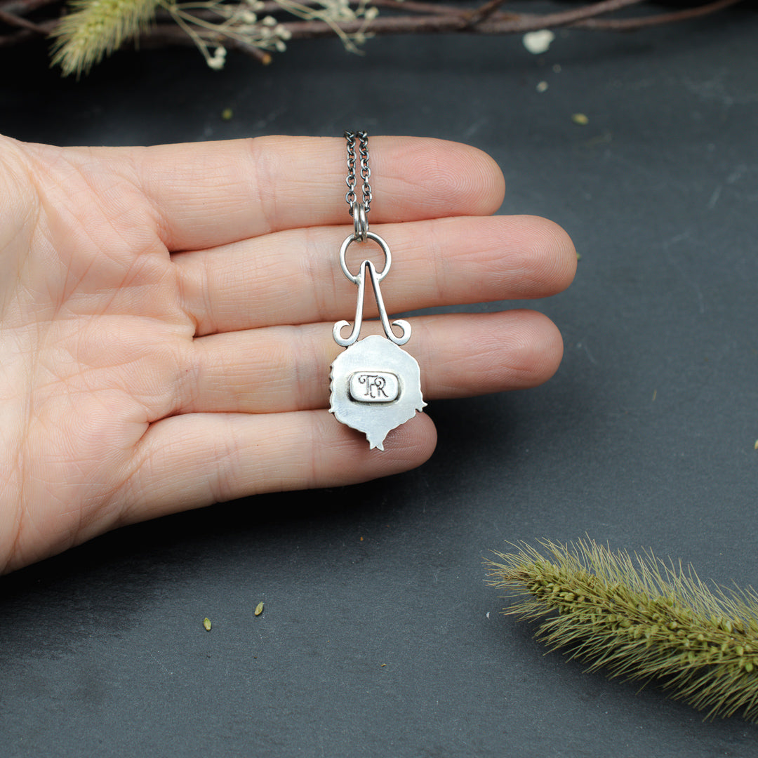 This pendant measures 1 1/2 inches long by 3/4 inch at the widest point.