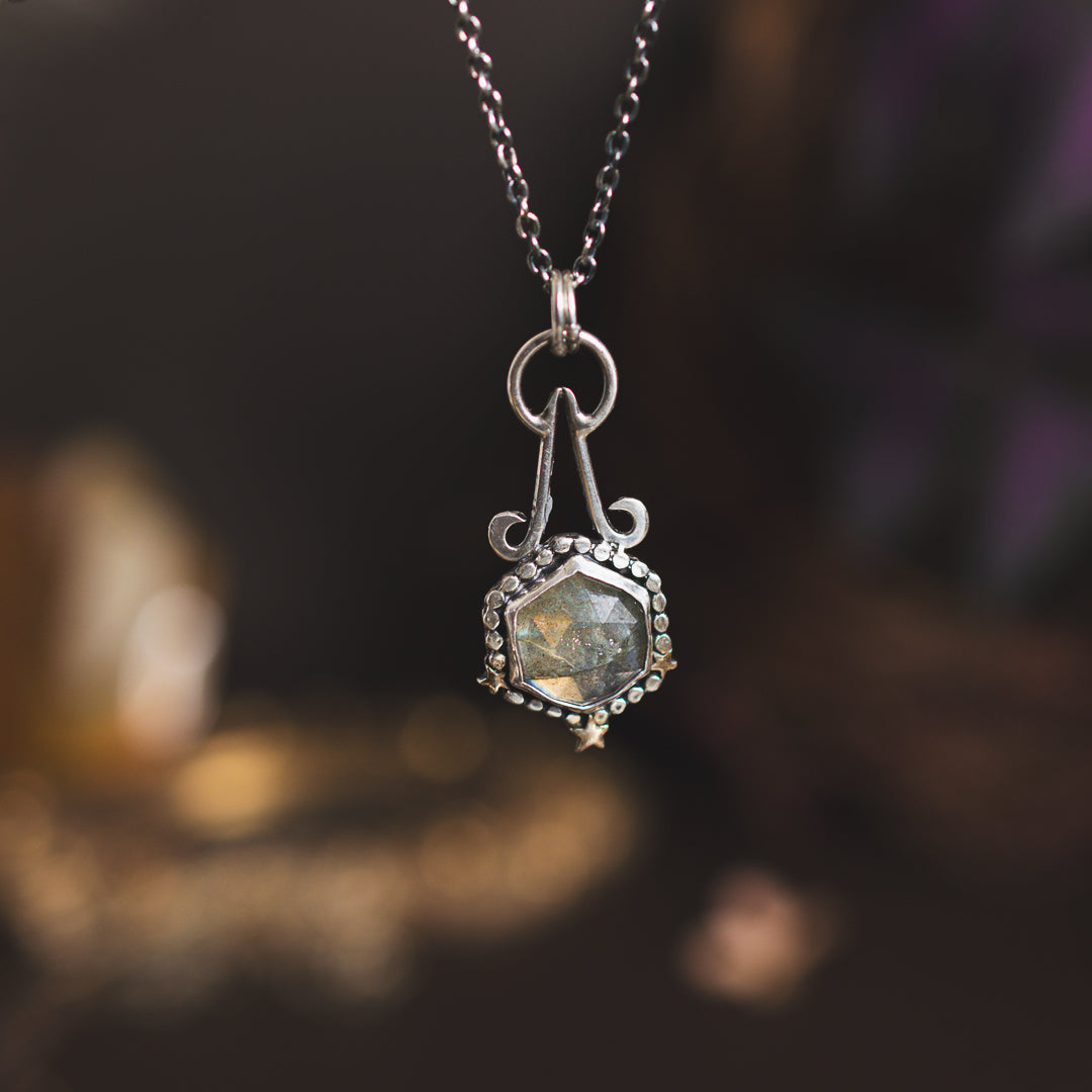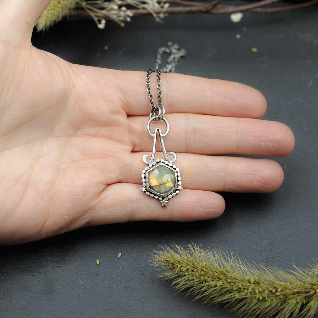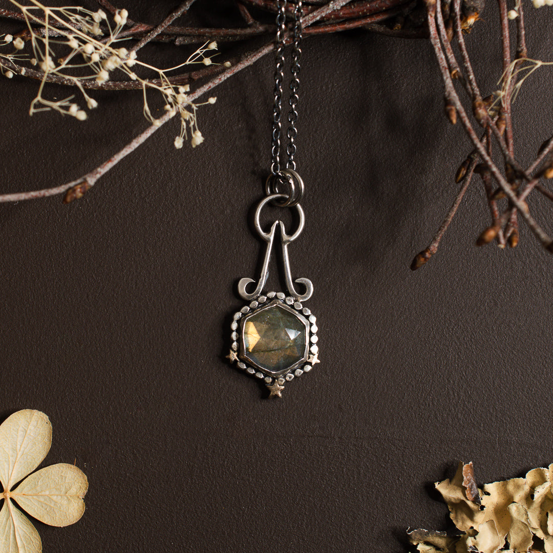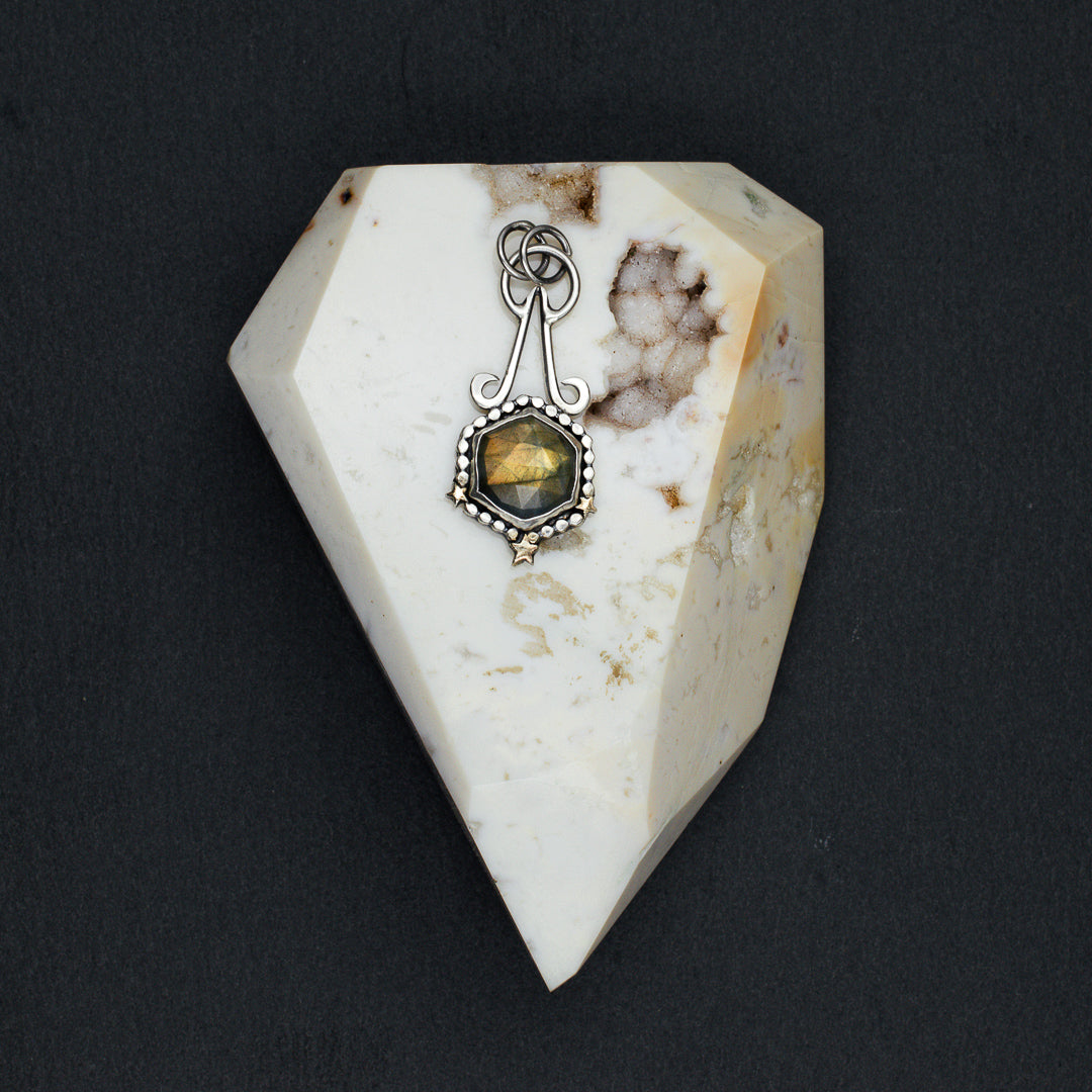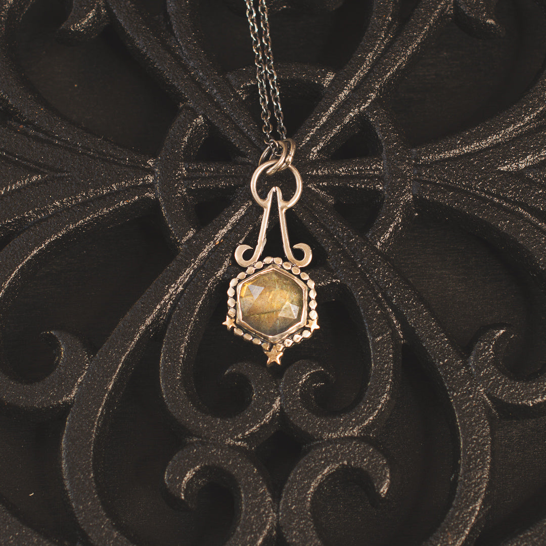 This stone amplifies the fire within. Labradorite flashes in so many different colors. This one is a vibrant gold. So warming and uplifting. I had to add some 18 kt gold plated stars to reflect that energy.