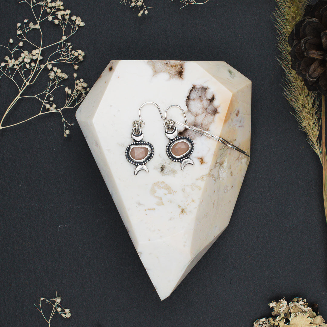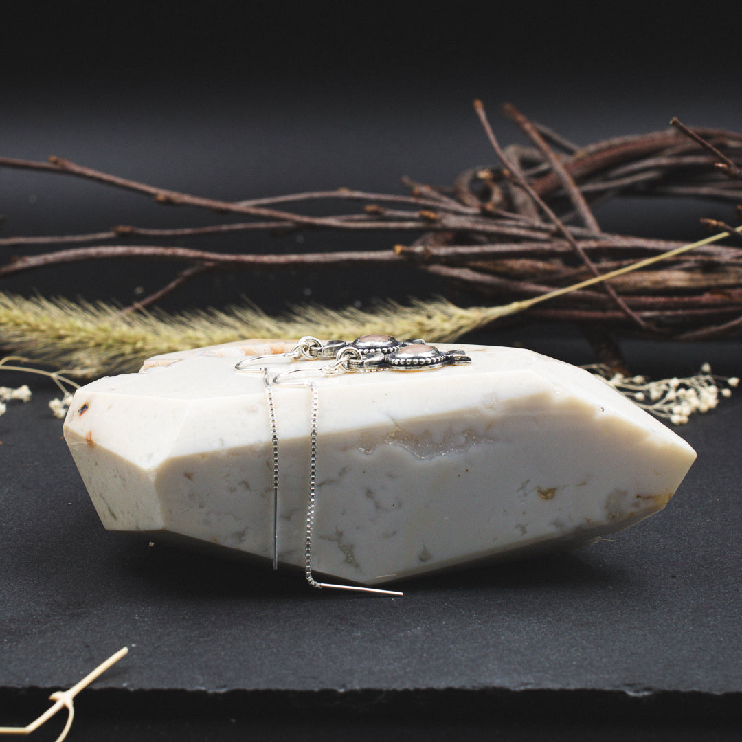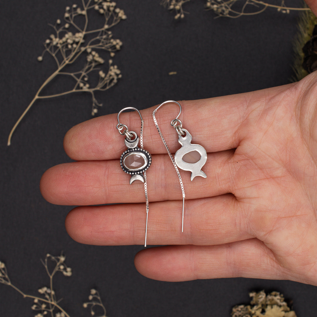These sterling silver ear threaders feature a delicate box chain that is 2 inches long. The peach moonstone dangle measures 1 inch long and is 1/2 an inch at the widest point.