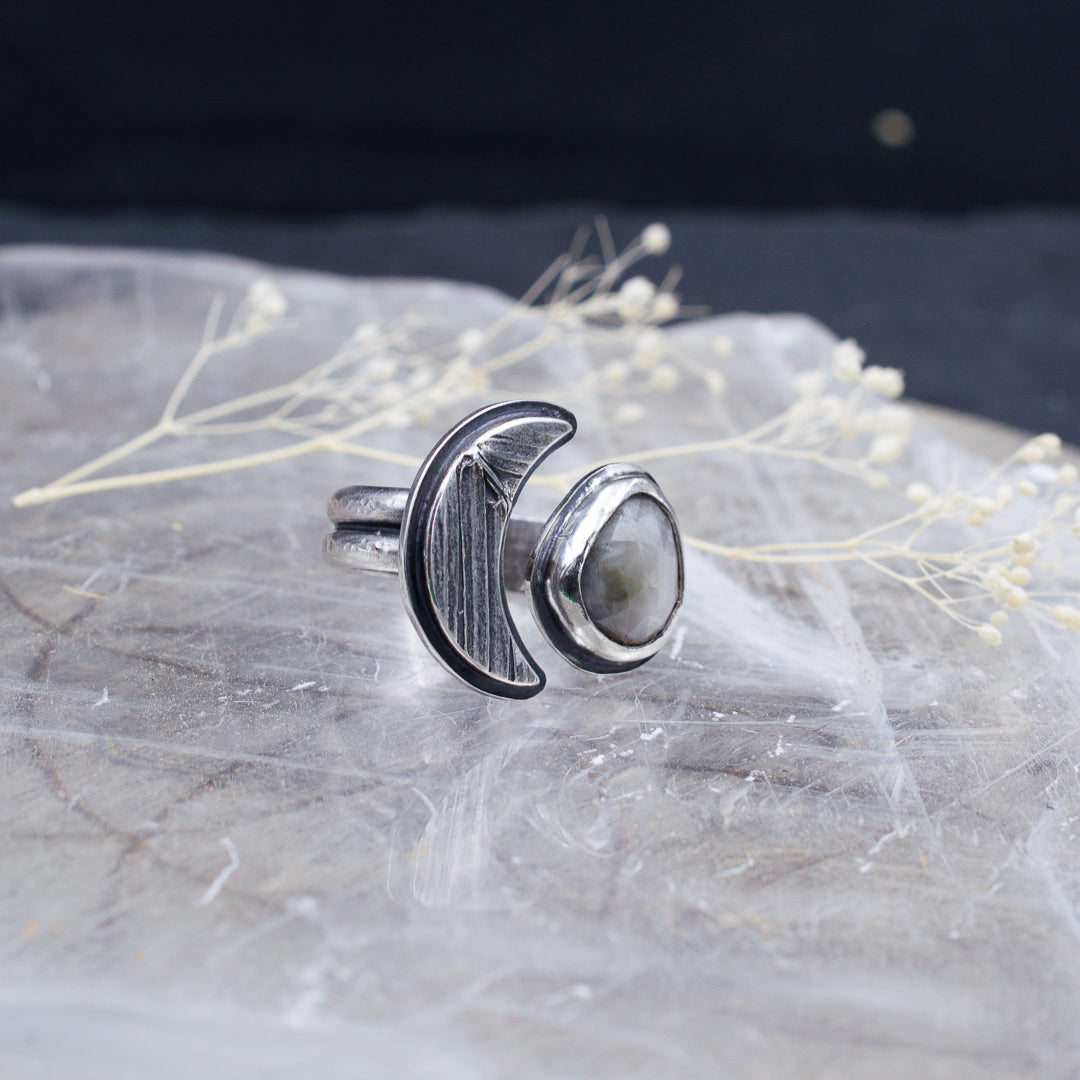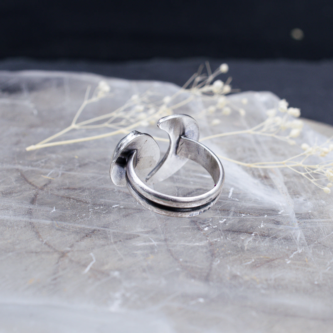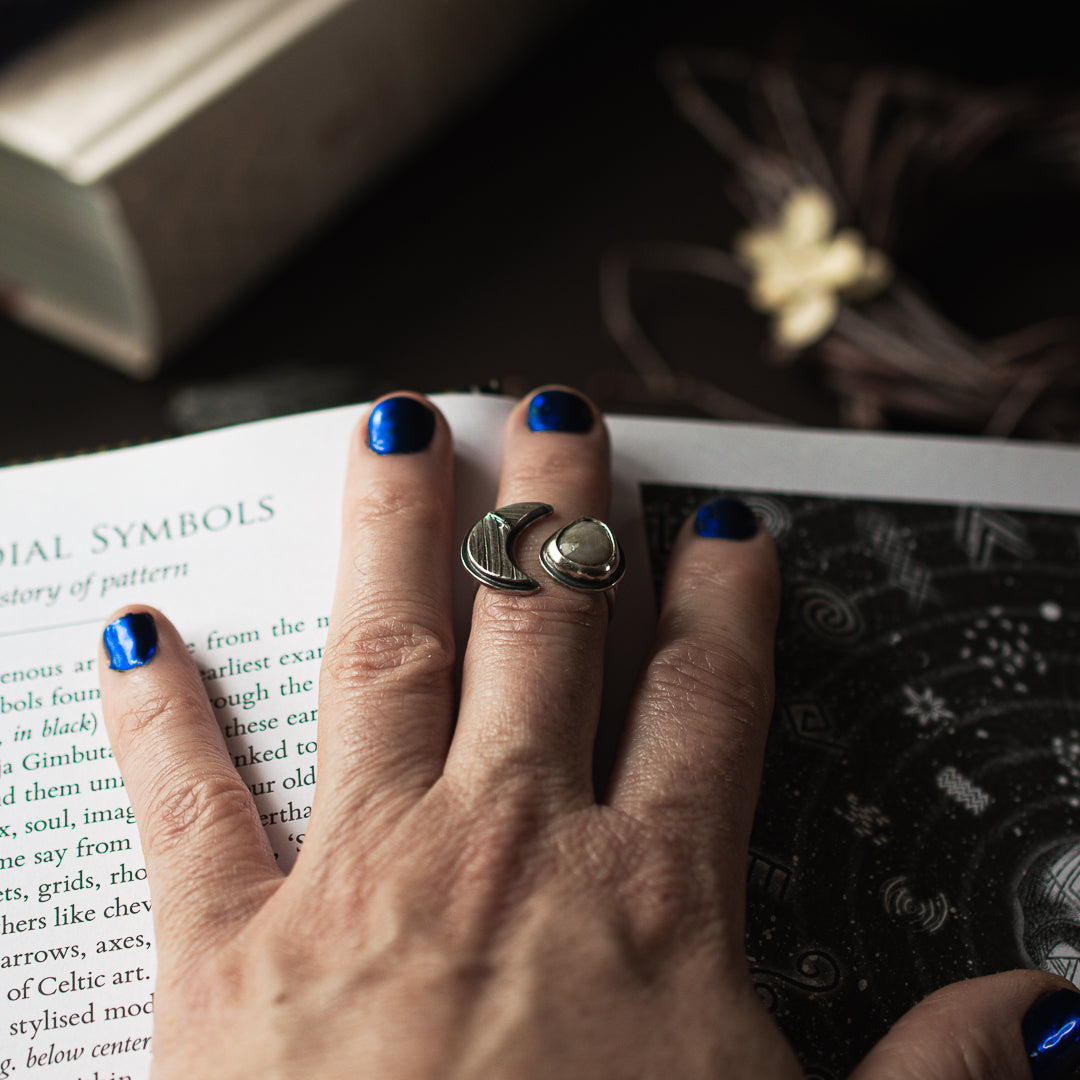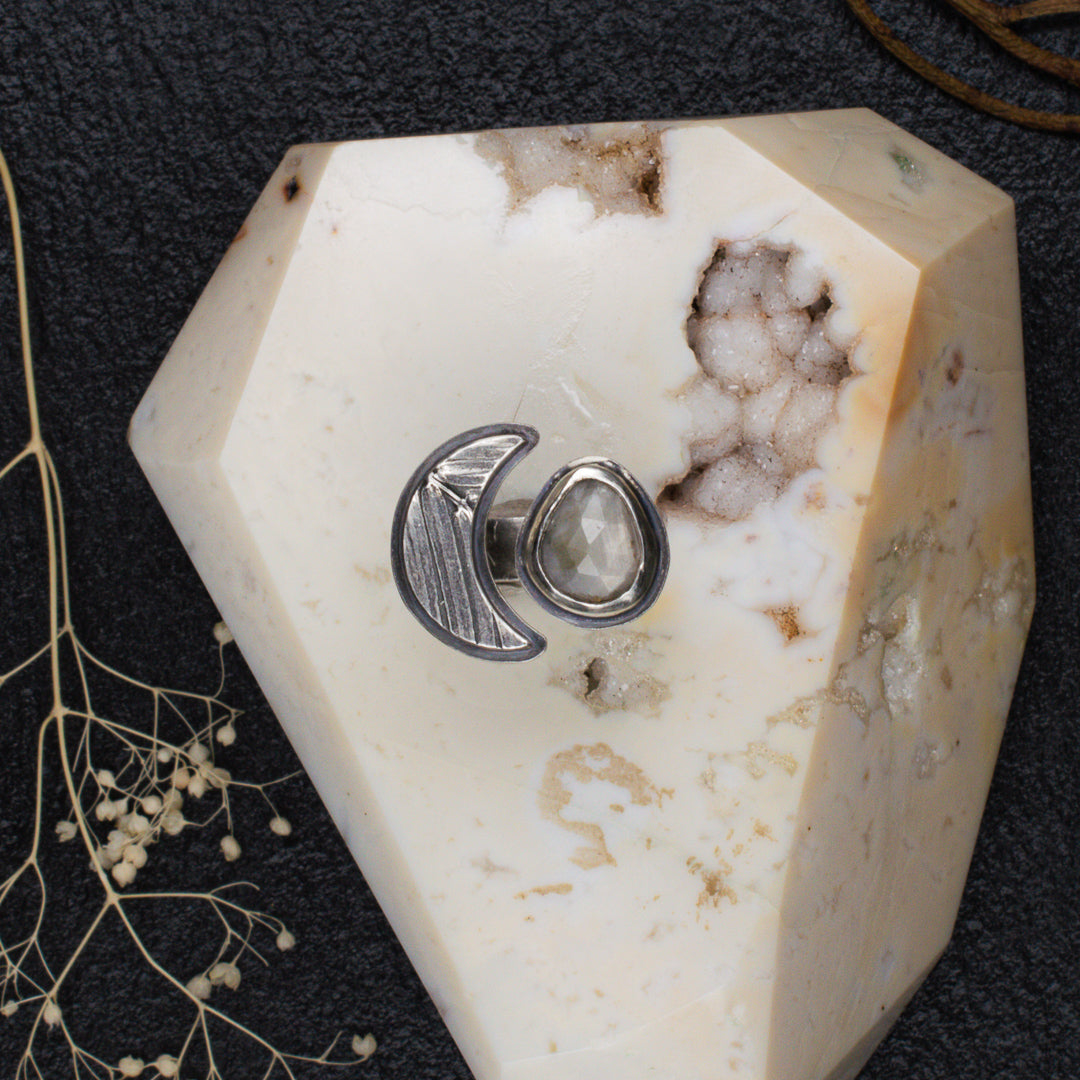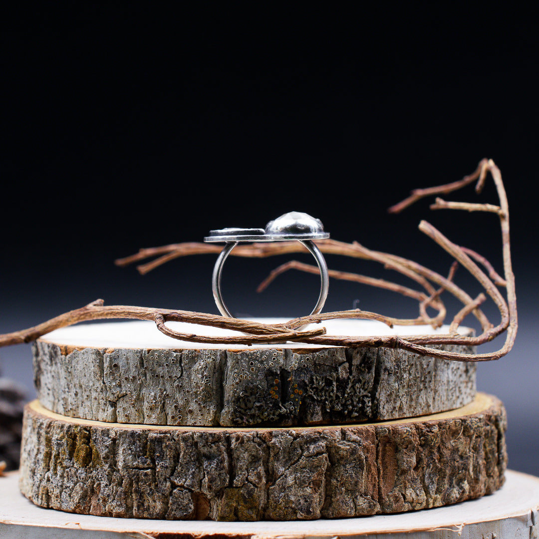I just love the sleek modern look this dawn redwood texture gives this ring. It’s paired with a silver sheen sapphire that emotes wisdom and clarity. The two together create a clean and neutral vibe that is sure to be your favorite statement ring.
