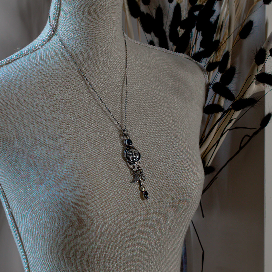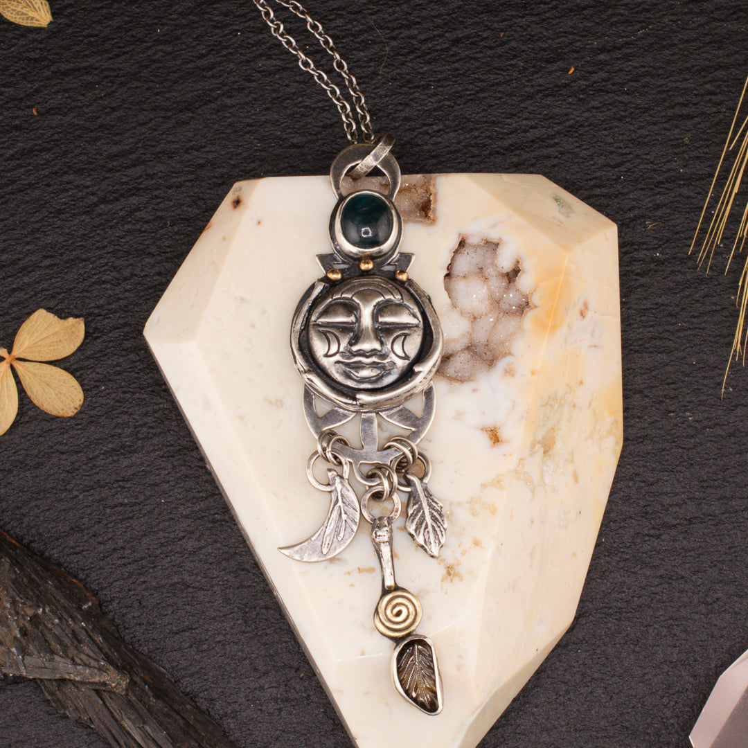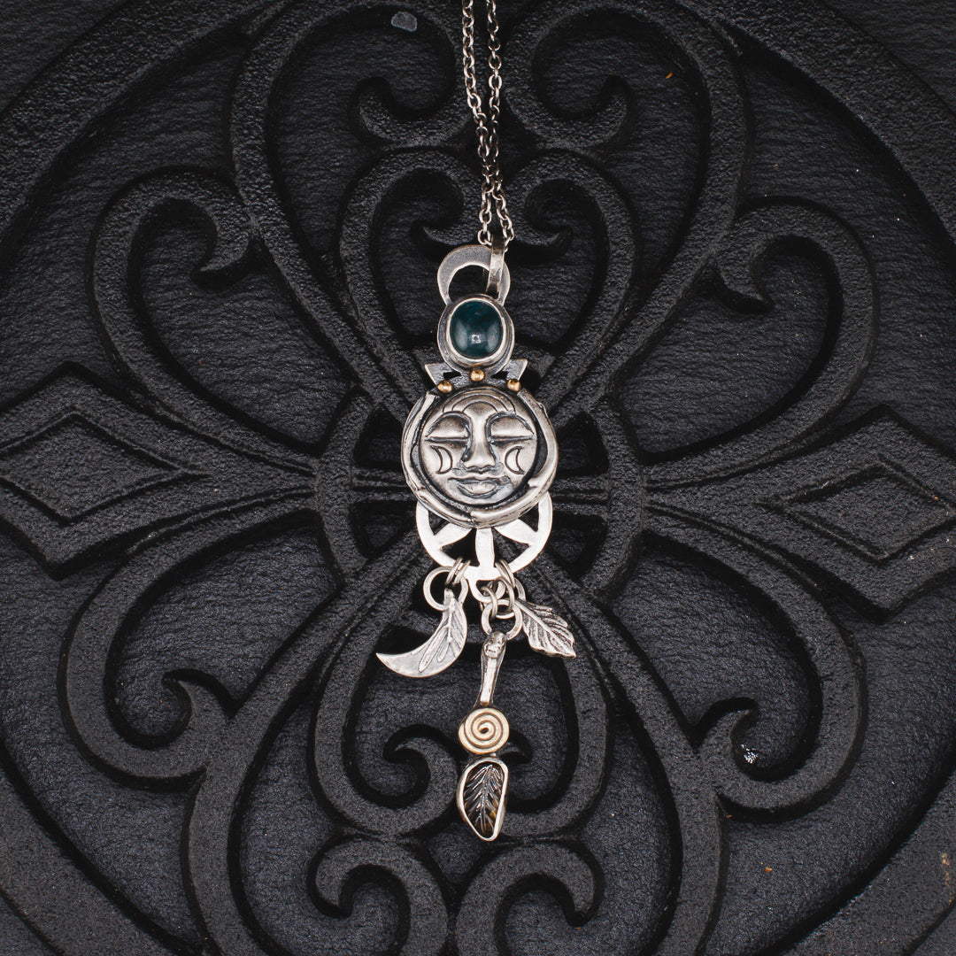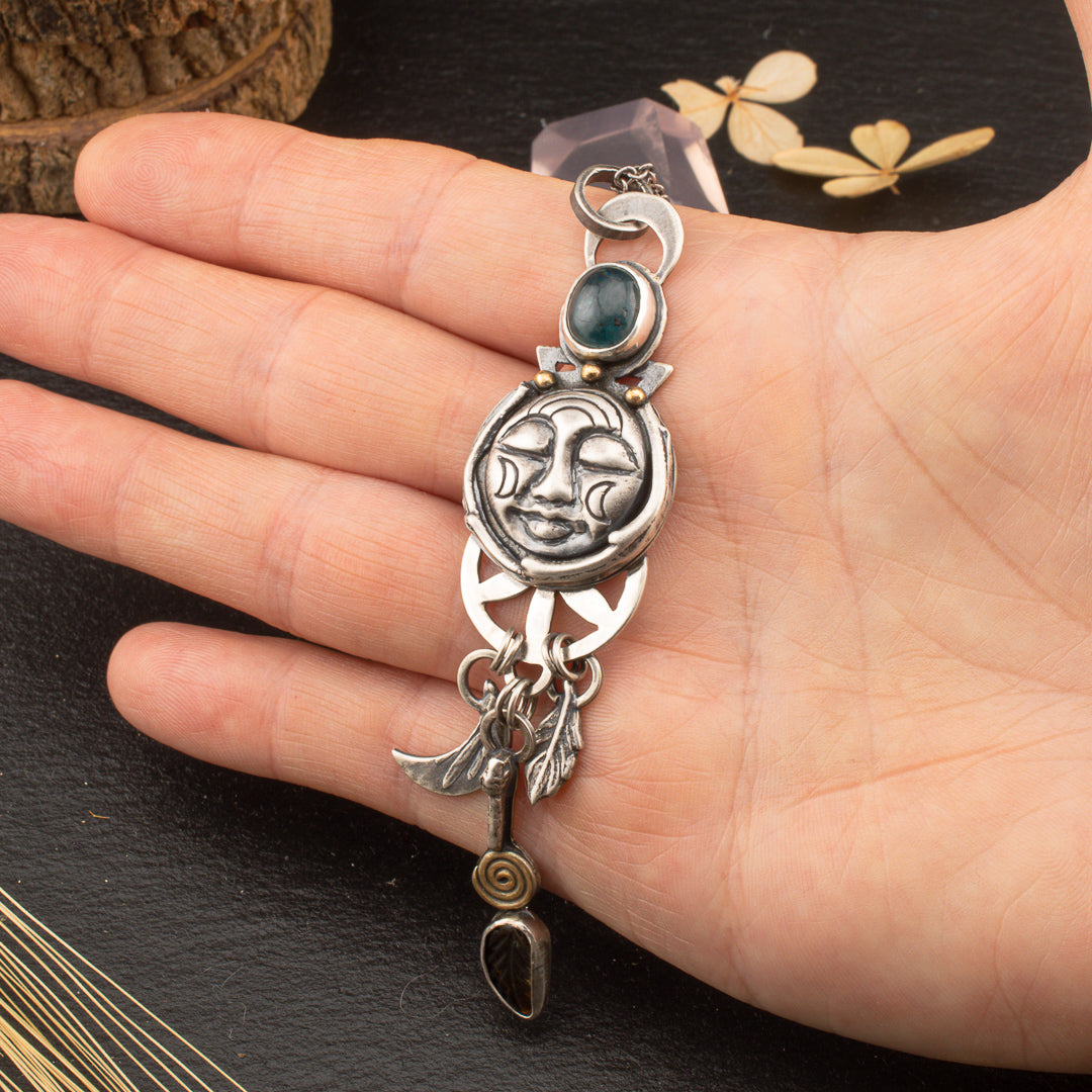 Dawn's Twilight | Sterling Silver Moon Face with Aqua Kyanite and Tourmaline Leaf