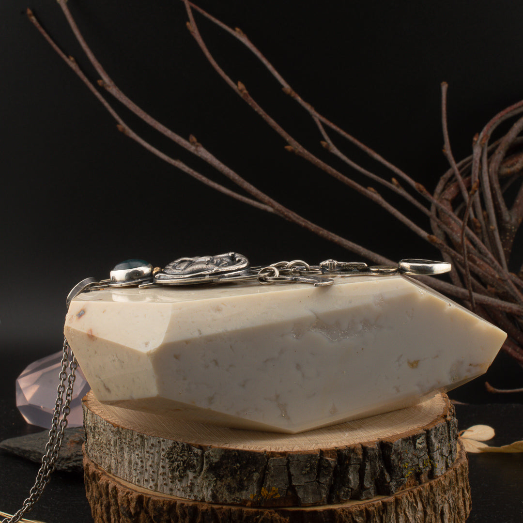 This touchstone taps into the energetic force of autumnal energy. I created a layered sacred geometry sigil that is the backbone of this piece. Hidden from everyone else, except you. The cycles of release and rebirth are as natural as our cycles of breath. Let the peaceful carved moonface be your guide as you relinquish your hold on what is no longer for you. Follow the tourmaline leaf drop and its message from the trees. They drop their leaves every fall knowing that new ones will appear in the spring. Release of the old is simply making room for the new. This talisman will guide you in the trust that something better is always coming in.
